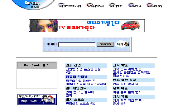 ¨ë ÄÚ½ÃÅ©(http://www.kor-seek.com) 1995³â¿¡ ¼ºñ½º¸¦ ½ÃÀÛÇÑ ±¹³» ÃÖÃÊÀÇ À¥ °Ë»ö¿£ÁøÀ¸·Î ¾Ë·ÁÁ® ÀÖ´Ù. ¿¬»êÀÚ¸¦ »ç¿ëÇÒ ¼ö ¾øÀ¸¸ç ÀÚü ºÒ¸®¾ð ¸ðµå¿¡ ÀÇÇØ ÀûÁßµµ°¡ ³ôÀº °ÍºÎÅÍ ¼ø¼´ë·Î °Ë»ö °á°ú°¡ Ãâ·ÂµÈ´Ù. È®Àå°Ë»ö°ú ÁÖÁ¦º° °Ë»ö, ´Ü¾îº° °Ë»öÀ» ÇÒ ¼ö ÀÖµµ·Ï Áö¿øÇϰí ÀÖ´Ù.