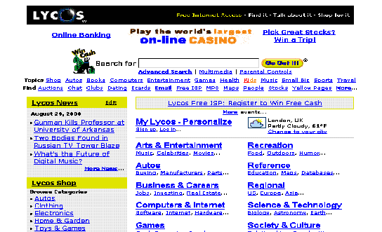 ¨è Lycos(http://www.lycos.com) 1995³â Ä«³×±â ¸È·Ð ´ëÇÐÀÇ ¸¶ÀÌÅ© L. ¸ôµò ¹Ú»ç°¡ °³¹ßÇÑ ÀÎÅÍ³Ý °Ë»ö¿£ÁøÀ¸·Î A2Z¼ºñ½º¿Í TOP 5%»çÀÌÆ®¸¦ Á¦°øÇÏ´Â °ÍÀ¸·Î ¸¹ÀÌ ¾Ë·ÁÁ® ÀÖ´Ù. SCOUT Indexer¶ó´Â ÀÚµ¿ °Ë»ö ·Îº¿À» ÅëÇØ ÇÏ·ç 5000¿©°³ ÆäÀÌÁö¸¦ °»½ÅÇϰí ÀÖÀ¸¸ç ´Ù¾çÇÏ°í ±¸Ã¼ÀûÀÎ °Ë»öÀ» ÇÒ ¼ö ÀÖ´Ù. ¸ÖƼ °Ë»ö°ú ÁÖÁ¦ °Ë»öÀÌ °¡´ÉÇÏ°í µð½ºÇ÷¹ÀÌ È¸éÀ» Á¶Á¤ÇÒ ¼ö ÀÖ´Ù.