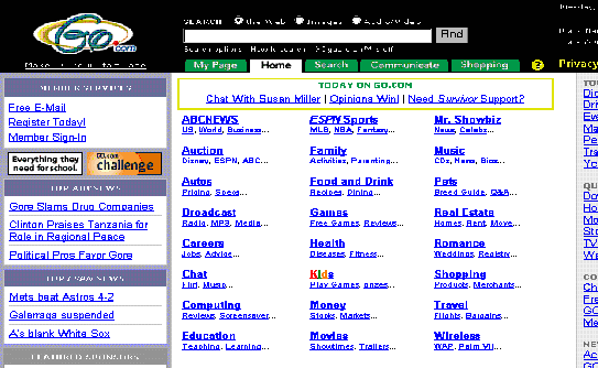 ¨ê InfoSeek(http://infoseek.go.com) 1994³â Steve Kirsch°¡ ¼³¸³ÇÑ ÀÎÆ÷½ÃÅ©»ç(Infoseek Corp.)°¡ dzºÎÇϰí ÀûÀýÇÑ ·¹ÄÚµå º¸À¯¿Í ½¬¿î °Ë»öÀ» À§ÇÑ °·ÂÇÏ°í °£ÆíÇÑ »ç¿ë¹ý, ¼öÁØ ³ôÀº °í°´ ¼ºñ½º¸¦ ¸ñÇ¥·Î °³¹ßÇÑ »ó¾÷¿ë °Ë»ö¿£ÁøÀ¸·Î ÇöÀç´Â ÁÖÁ¦º° °Ë»öµµ Áö¿øÇÏ´Â »ó´çÈ÷ °ø½Å·ÂÀÌ ÀÖ´Â »çÀÌÆ®°¡ µÇ¾ú´Ù. ¸¹Àº °á°ú¸¦ Ãâ·ÂÇÏÁö¸¸ ¾ßÈÄ¿Í °°ÀÌ Á¤È®ÇÑ Á¤º¸¸¦ Á¦°øÇÏ´Â °ÍÀÌ ÀåÁ¡ÀÌ´Ù. ´Ù¾çÇÑ ºÐ¾ßÀÇ °Ë»ö°ú Àç°Ë»öÀÌ °¡´ÉÇϸç ÀÚ¿¬¾î °Ë»öµµ °¡´ÉÇÏ´Ù. ÃÖ±Ù »çÀÌÆ®ÀÇ À̸§À» 'Go Network'·Î °³¸íÇÏ¿´´Ù.