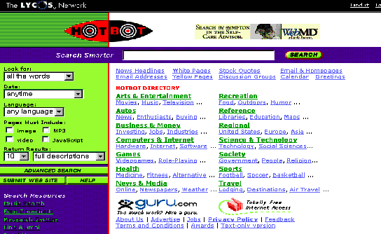 ¨ë HotBot(http://www.hotbot.com) 1996³â 5¿ù¿¡ ¼ºñ½º¸¦ ½ÃÀÛÇÑ °ÍÀ¸·Î HotWired¿Í ½Å»ý±â¾÷ÀÎ InkTomi °¡ ÇÔ²² InkTomi¶ó´Â °Ë»ö¿£ÁøÀÇ ±â¼úÀ» º¸´Ù ¹ßÀü½ÃŰ°í ´ëÁßÀûÀ¸·Î °³¹ßÇÑ °Ë»ö¿£ÁøÀÌ´Ù. Á¤±³ÇÑ °Ë»ö°ú Ãʺ¸ÀÚµµ »ç¿ëÇϱ⠽¬¿î ÀÎÅÍÆäÀ̽º¸¦ Ư¡À¸·Î Çϸç À¥ ¹®¼, À¯Áî³Ý ´º½º, ÀüÀÚ¿ìÆí ÁÖ¼Ò, ¸ÞÀϸµ ¸®½ºÆ®, ÁÖ½Ä Á¤º¸ µîÀ» °Ë»öÇÒ ¼ö ÀÖ´Ù. ¶Ç, ƯÁ¤ ÇüÅÂÀÇ ÀڷḸÀ» ´ë»óÀ¸·Î °Ë»öÇÒ ¼öµµ ÀÖ°í Æ¯Á¤ÇÑ Áö¿ª(À¯·´, ¾Æ½Ã¾Æ, ¾ÆÇÁ¸®Ä« µî)À» ´ë»óÀ¸·Î °Ë»öÇÒ ¼ö ÀÖ´Ù.