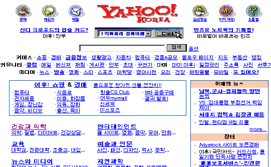 1) ±¹³» ¨ç ¾ßÈÄ ÄÚ¸®¾Æ(http://kr.yahoo.com) 1997³â 9¿ù 1ÀϺÎÅÍ ¿ì¸® ³ª¶ó¿¡¼ ¾ßÈÄ ÄÚ¸®¾Æ°¡ ¼ºñ½º¸¦ ½ÃÀÛÇÏ¿´´Ù. ¹Ì±¹, ij³ª´Ù, ÇÁ¶û½º, µ¶ÀÏ, ÀϺ», ¿µ±¹, ½Ì°¡Æ÷¸£, È£ÁÖ¿¡ ÀÌ¾î ¾ÆÈ© ¹øÂ°·Î ¼³¸³µÇ¾ú´Ù. '°Ç°°ú ÀÇÇÐ'¿¡¼ 'ÄÄÇ»ÅÍ¿Í ÀÎÅͳÝ'¿¡ À̸£´Â 14°³ÀÇ ÁÖÁ¦·Î ºÐ·ùµÈ À¥»çÀÌÆ®µéÀ» °Ë»öÇÒ ¼ö ÀÖ°í, Çѱ۷Π±¸¼ºµÈ »çÀÌÆ®µé¸¸À» ´ë»óÀ¸·Î ÇÑ´Ù. ¶ÇÇÑ, À¥»çÀÌÆ®¿Í À¯Áî³ÝÀ» ´ë»óÀ¸·Î °Ë»öÇÒ ¼öµµ ÀÖ´Ù.