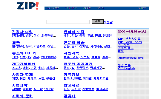 1997³âºÎÅÍ ¼ºñ½ºµÇ°í ÀÖ´Â ÇÑ/¿µ µð·ºÅ丮 °Ë»ö¿£ÁøÀ¸·Î °¢ ºÐ¾ßº°·Î Àü¹® »çÀÌÆ®¸¦ ü°èÀûÀ¸·Î Á¤¸®ÇÏ¿© ã±â ½±°Ô ÇØ ³õ°í ÀÖ´Ù. ÁÖÁ¦º°·Î ã¾Æ µé¾î°¡´Â °ÍÀÌ ½±°Ô µÇ¾î ÀÖ°í ¿øÇÏ´Â Á¤º¸¿¡ °ü·ÃµÈ °Ë»ö¾î¸¦ »ç¿ëÇÏ¿© ãÀ» ¼öµµ ÀÖ´Ù. ZIPÀº ´Ù¸¥ °Ë»ö¿£Áø°ú´Â ´Þ¸® »ç¿ëÀÚ ¹× Àü¹® °Ë»ö°¡°¡ Á÷Á¢ »ç¶÷ÀÇ ¼ÕÀ¸·Î ÀÎÅͳÝÀÇ ÀÚ¿ø·Á¤º¸¸¦ ÁÖÁ¦º°·Î Á¤¸®·ºÐ·ùÇÑ ÀÚ·áµéÀ» °Ë»ö ¼ºñ½ºÇϰí ÀÖ´Ù. µû¶ó¼ ƯÁ¤ ÁÖÁ¦¿¡ ´ëÇÑ ÇʼöÀûÀÎ Á¤º¸µéÀ» Áß½ÉÀ¸·Î °Ë»öÀÌ °¡´ÉÇÏ´Ù.
