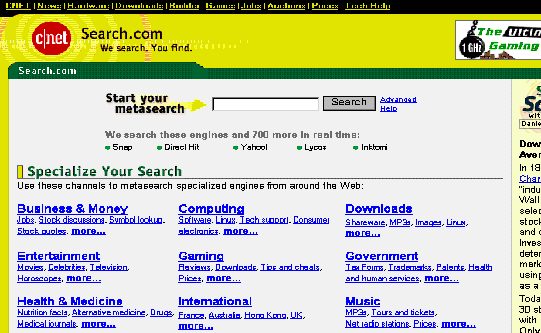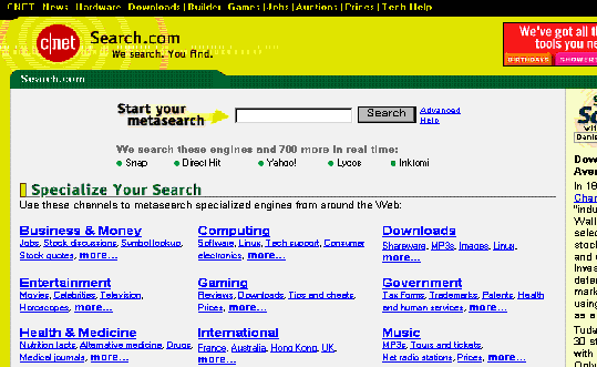 1995³â 6¿ù 1ÀϺÎÅÍ ¼ºñ½º°¡ Á¦°øµÇ¾ú´Ù. 500°³ ÀÌ»óÀÇ °Ë»ö¿£ÁøµéÀ» ¿ëµµº°(Àι°, À¥, ¼ÒÇÁÆ®¿þ¾î, ´º½º/³¯¾¾ µî)·Î ¸ð¾Æ ÇÑ °³ÀÇ »çÀÌÆ®·Î ¸¸µç °Ë»ö ¿£ÁøÀÌ´Ù. ¨è Search.com(http://search.cnet.com) CNET¿¡¼ ¿î¿µÇÏ´Â ¸ðÀ½Çü °Ë»ö¿£ÁøÀ¸·Î 1996³â¿¡ ¼ºñ½º¸¦ ½ÃÀÛÇÏ¿´´Ù. °¢ ºÐ¾ßº°·Î ºÐ·ùÇÏ¿© ³õÀº °Ë»ö¿£ÁøÀÇ ¼ö°¡ 500¿© °³³ª µÇ°í ¸ðÀ½Çü °Ë»ö¿£ÁøÀε¥µµ ÀÚüÀûÀÎ °Ë»ö¿£Áø 'Snap!'À» ÅëÇÑ ¼ºñ½ºµµ Á¦°øÇϰí ÀÖ´Ù.