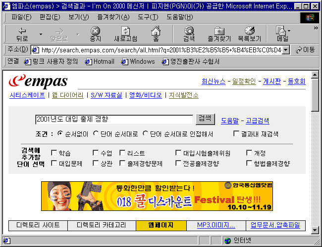 (°¡) ¿¥ÆÄ½º(http://www.empas.com) ¿¥ÆÄ½º °Ë»ö ¼ºñ½º´Â ¼þ½Ç´ëÇб³ ÀÌÁØÈ£ ±³¼öÆÀÀÌ °³¹ßÇÑ 'AidSearch' ½Ã½ºÅÛÀ» ±â¹ÝÀ¸·Î (ÁÖ)Áö½Ä¹ßÀü¼Ò°¡ °øµ¿À¸·Î °³¹ßÇÑ ÀÚ¿¬¾ð¾î ¹æ½ÄÀ» Á¦°øÇÏ´Â °Ë»ö »çÀÌÆ®ÀÌ´Ù. »ç¶÷µéÀÌ ¸»ÇÏ´Â ´ë·Î, »ý°¢³´ë·Î °Ë»ö¾î¸¦ ÀÔ·ÂÇÏ¿© Á¤º¸¸¦ Á»´õ ½±°í ºü¸£°í Á¤È®ÇÏ°Ô Ã£¾ÆÁÖ¸ç, °Ë»ö ¼ºñ½º¿Í µð·ºÅ丮 ¼ºñ½º°¡ °áÇÕµÈ ÅëÇÕ ÀÎÅÍ³Ý Á¤º¸ ¼ºñ½ºÀÌ´Ù. °Ë»ö´ë»ó, °Ë»ö¹üÀ§, °Ë»ö¿µ¿ª, ±×¸®°í Á¤º¸ÀÇ Á¾·ù µî¿¡ µû¶ó ´Ù¾çÇÑ °Ë»ö ¿É¼ÇÀ» Á¦°øÇϰí, ºÒÇÊ¿äÇÑ Á¤º¸µéÀ» ¿øÃµÀûÀ¸·Î ¹èÁ¦ÇÏ´Â ¶Ù¾î³ ¼º´ÉÀ» °¡Áö°í ÀÖ´Ù. °í±Þ °Ë»ö±â´É, »çÀÌÆ® À̸§ °Ë»ö, À̹ÌÁö ÆÄÀÏ °Ë»ö, »ç¿îµå ÆÄÀÏ °Ë»ö, MP3 ÆÄÀÏ °Ë»ö, µ¿¿µ»ó ÆÄÀÏ °Ë»ö, ¾÷¹«¹®¼ ÆÄÀÏ °Ë»ö (.hwp, .doc, .rtf, .txt,